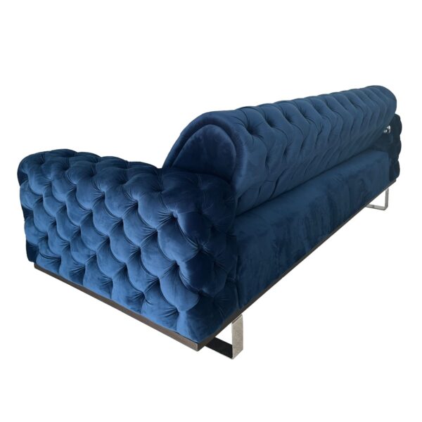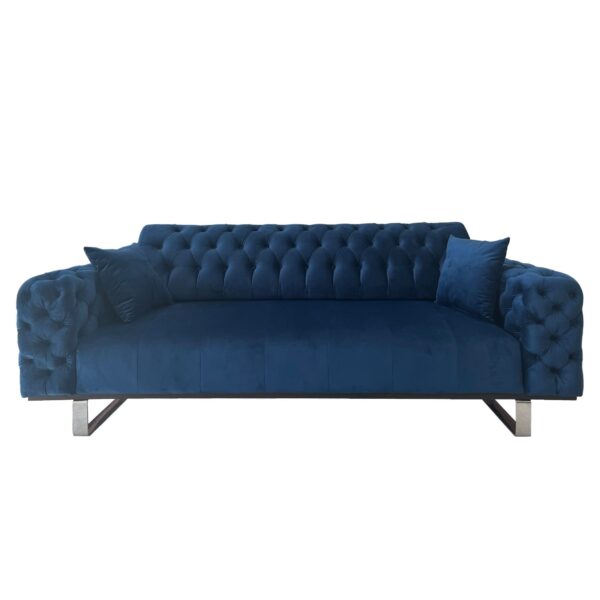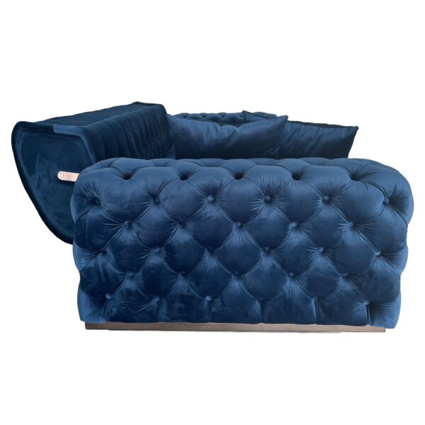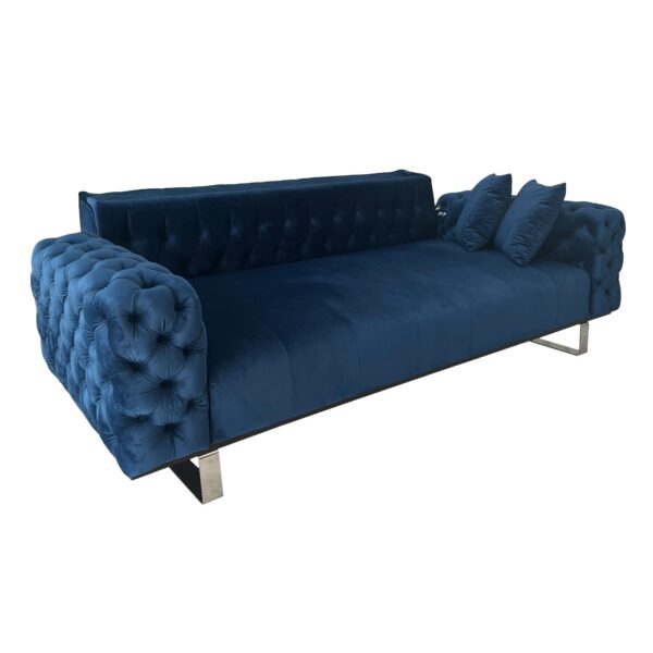 Canapeaua Opulenza este o piesa de mobilier ce va aduce un plus de eleganta in camera de zi, sufragerie sau living. Designul este unul atractiv, fiind potrivit pentru orice stil de amenajare. Canapeaua este capitonata cu stofa, prezinta butoni clasici si forme rotunjite, aspect ce ofera un aer clasic, adus din rafinamentul britanic. Picioarele cromate sunt accentul potrivit pentru un plus de originalitate. Nuanta de albastru este ideala pentru amenajarea unui spatiu rafinat, in care culorile se armonizeaza si se potenteaza reciproc. Datorita texturii catifelate a stofei, in functie de conditiile de iluminare din camera, culoarea poate varia. In alegerea produsului este bine sa va orientati dupa imaginea cu mostra de tapiterie.