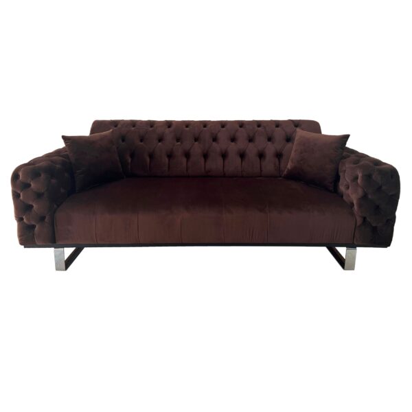 Canapeaua Opulenza este o piesa de mobilier ce va aduce un plus de eleganta in camera de zi, sufragerie sau living. Designul este unul atractiv, fiind potrivit pentru orice stil de amenajare. Canapeaua este capitonata cu stofa, prezinta butoni clasici si forme rotunjite, aspect ce ofera un aer clasic, adus din rafinamentul britanic. Picioarele cromate sunt accentul potrivit pentru un plus de originalitate. Nuanta de maro utilizata este usor de integrat in orice ambient, fiind o culoare pamantie. Datorita texturii catifelate a stofei, in functie de conditiile de iluminare din camera, culoarea poate varia. In alegerea produsului este bine sa va orientati dupa imaginea cu mostra de tapiterie.