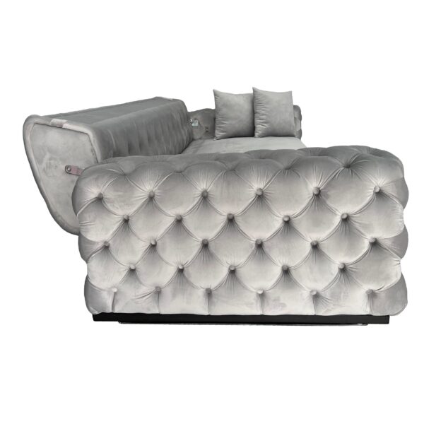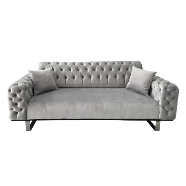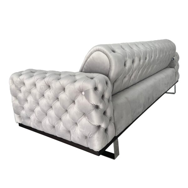 Canapeaua Opulenza este o piesa de mobilier ce va aduce un plus de eleganta in camera de zi, sufragerie sau living. Designul este unul atractiv, fiind potrivit pentru orice stil de amenajare. Canapeaua este capitonata cu stofa, prezinta butoni clasici si forme rotunjite, aspect ce ofera un aer clasic, adus din rafinamentul britanic. Picioarele cromate sunt accentul potrivit pentru un plus de originalitate. Nuanta silver a canapelei este ideala pentru amenajarea unei camere cu aspect sofisticat. Datorita texturii catifelate a stofei, in functie de conditiile de iluminare din camera, culoarea poate varia. In alegerea produsului este bine sa va orientati dupa imaginea cu mostra de tapiterie.