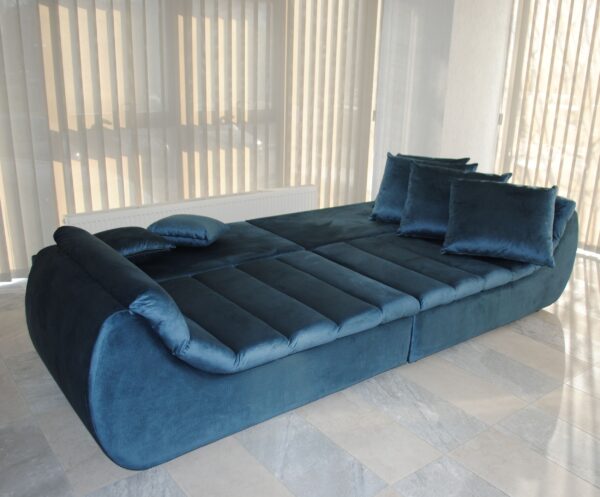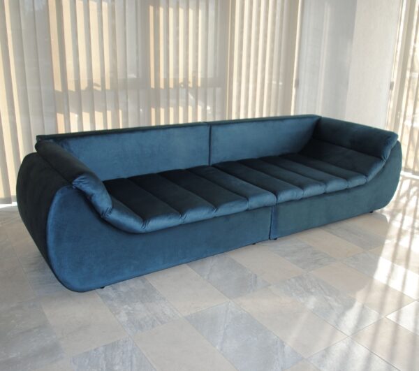 Canapeaua Party este caracterizata de un design si o functionalitate aparte, datorita elementelor care asigura unicitate si creeaza un ambient rafinat in locuinta. Tapiteria din stofa albastru topaz adauga o pata de culoare atractiva in orice amenajare interioara moderna sau glamour.