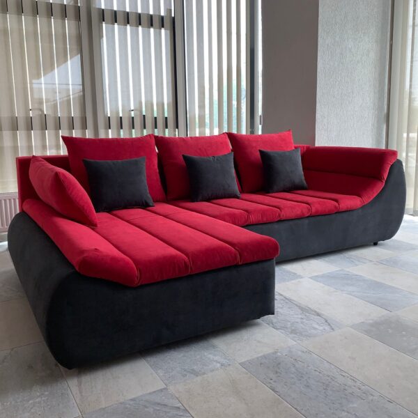 Cele 7 perne sunt realizate din stofa in cele doua nuante prezente si pe tapiteria coltarului, respectiv 4 perne cu stofa rosie si 3 perne cu stofa neagra. Acestea asigura suport si confort.